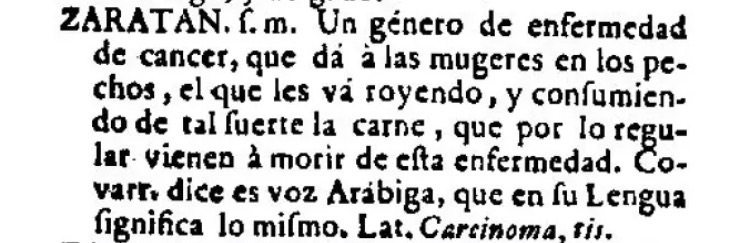 Zaratán. Una palabra de origen árabe, que según el Diccionario de Autoridades (RAE, tomo VI, 1739) tiene un significado mantenido en el tiempo, como “un género de enfermedad de cancer, que dá à las mugeres en los pechos, el que les vá royendo, y consumiendo de tal suerte la carne, que por lo regular vienen à morir de esta enfermedad. Covarrubias dice es voz Arábiga, que en su Lengua significa lo mismo. Lat. Carcinoma, tis”. Este lema se ha modulado posteriormente hasta nuestros días, en la última versión del Diccionario de la Lengua Española (RAE: 23.ª ed., 2014), como voz “derivada del árabe hispánico saraṭán, y este del árabe clásico saraṭān, literalmente ‘cangrejo’”, con un significado rotundo: “cáncer de mama en la mujer”.