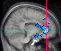 El cerebro feliz. Las zonas señaladas en rojo, la corteza cingulada anterior y la amígdala, aparecen con activación importante en la fMRI.