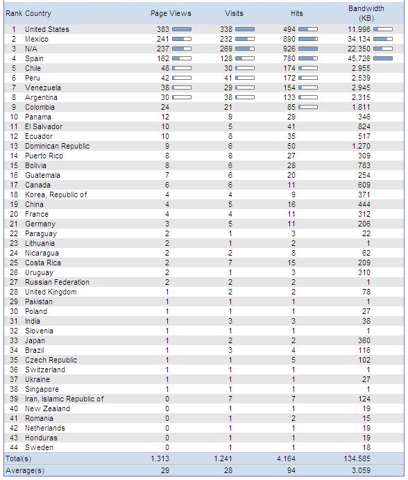 Para empezar, conozco los cuarenta y cuatro países de los que provenían las 1.241 visitas, auténticos miembros de la malla pensante (Noosfera), con el siguiente detalle por rangos, accesos reales y ancho de banda consumido (se puede hacer «clic» sobre la imagen para verla en tamaño real):