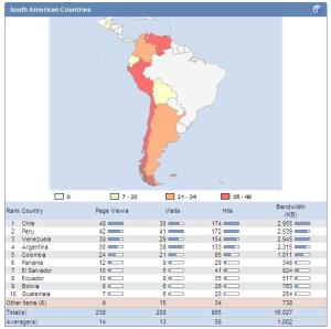 He obtenido, obviamente, la estadística de accesos por continente, sirviendo de muestra la de Europa, aunque por curiosidad científica también aporto la de América del Sur: