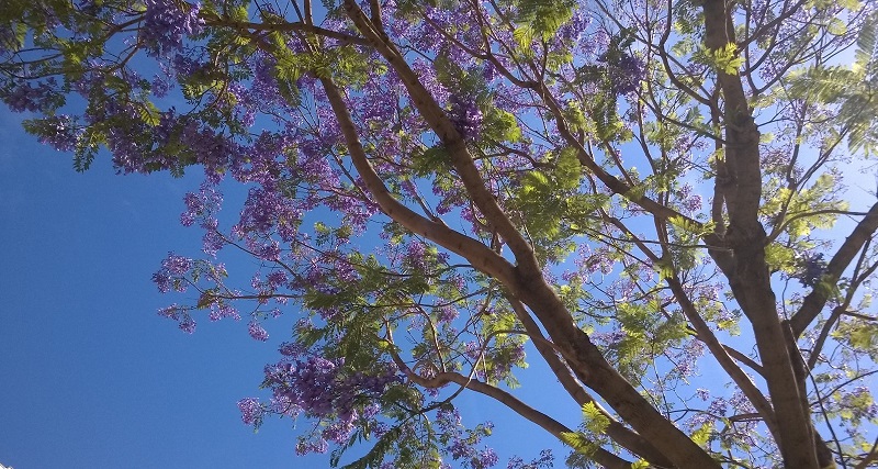 Disputa su posición en la ciudad con las buganvillas ante miles de ojos buscadores de otra forma de admirarse y ver como transcurre la cotidianidad de la vida vestida con vistosos colores, porque saben que Antonio Machado recomendó cómo utilizar el campo de la visión personal e intransferible: «El ojo que ves no es ojo porque tú lo veas; es ojo porque te ve.». Con él he paseado esta mañana por aceras-alfombra de jacarandá, buscando el sentido de un acertijo ético que escribió junto a su manera de ver a las otras personas, a la vida: Entre el vivir y el soñar hay una tercera cosa. Adivínala. Y buscando la mejor respuesta la he encontrado también en él: el despertar a nuevas sensaciones en tiempos revueltos, de turbación, donde a diferencia de la recomendación de Ignacio de Loyola, procuro hacer alguna mudanza cuando voy de mi corazón a mis asuntos: “Tras el vivir y el soñar, está lo que más importa: despertar”.