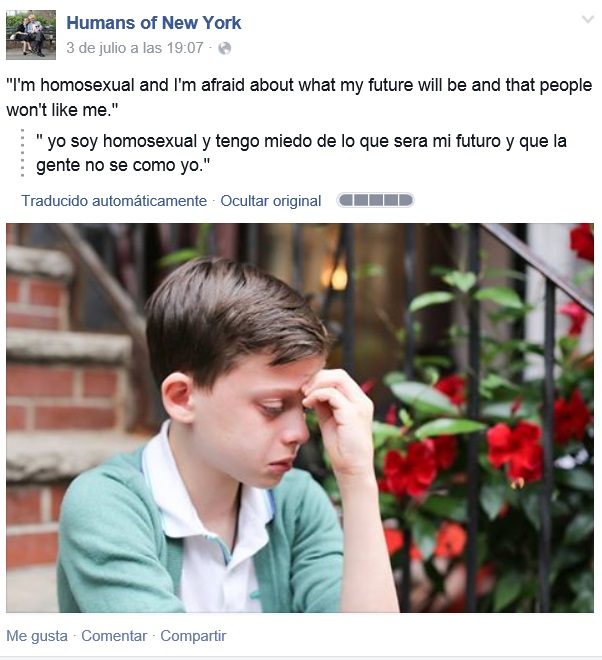La doble moral americana no tiene límites. Esta noticia no es una más en la crónica de sucesos indeseables porque tiene un contenido especial, tal y como la hemos conocido en nuestro país a través del Huffington Post: “Cuando un niño tiene miedo de su futuro por ser homosexual es momento de detenernos, reflexionar y analizar si algo está fallando en nuestra sociedad. El 3 de julio, Humans of New York, un proyecto creado hace cinco años por el fotógrafo Brandon Stanton, publicó en su página de Facebook la fotografía de un niño llorando acompañada de la siguiente descripción: «Soy homosexual y me da miedo mi futuro y que no le agrade a las personas».