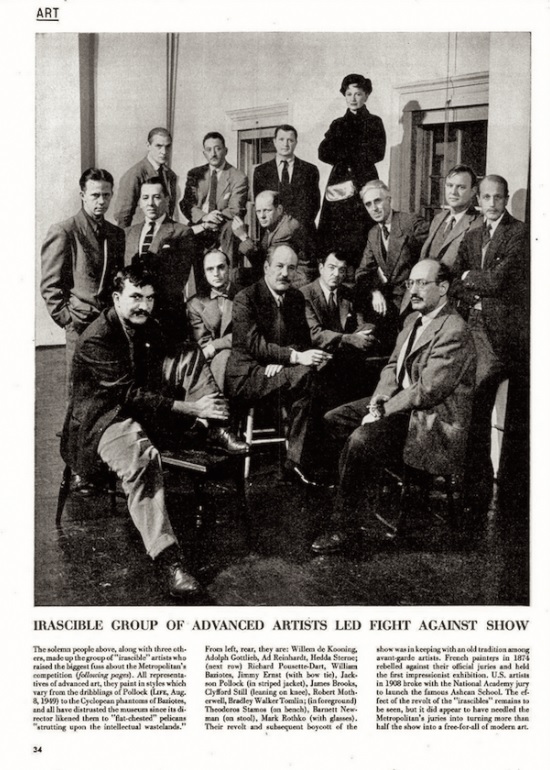 Me ha llamado la atención este hecho histórico porque resume muy bien la confrontación que siempre se ha dado en todas las artes entre lo conceptualmente clásico y moderno (bohemio, a veces), a través de diferentes representaciones. La fotografía que encabeza estas palabras representa la generación de artistas conocida como Escuela de Nueva York, habiendo sido publicada por la revista LIFE el 15 de enero de 1951, en su página 24 dedicada a ARTE, con un pie muy significativo: Un grupo irascible de artistas avanzados ha liderado la lucha contra una exposición. Era el símbolo de una protesta colectiva, anunciada y escrita, por parte de un grupo de pintores y escultores que representaban el arte moderno y actual de Nueva-York ante el Metropolitan Museum of Art que había convocado para finales del año 1950 un concurso teledirigido por las fuerzas vivas artísticas de Nueva York (American Painting Today, Pintura estadounidense actual), muy lejos de sus planteamientos rompedores en el arte americano del momento.