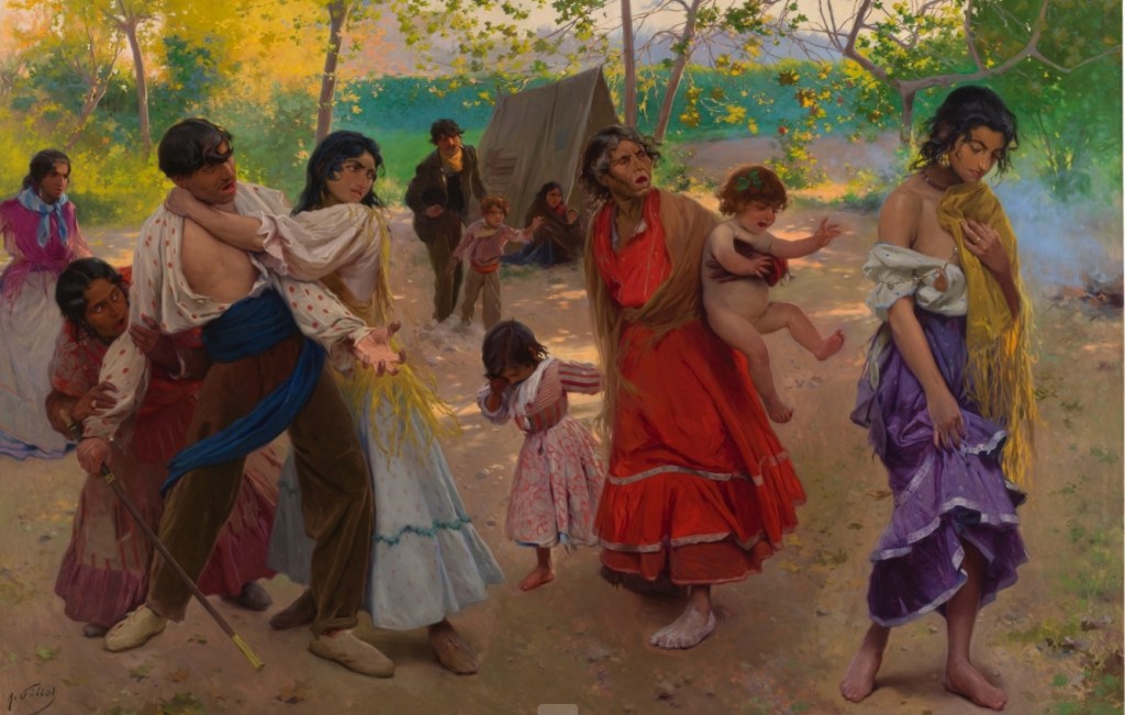 Es muy llamativa la obra de Antonio Fillol Granell (1870-1930), porque sus obras, en consonancia con lo que el Sistema aceptaba de la representación social de la mujer, se exponía sin tapujos por el realismo de su pintura, acorde con la legitimación del papel de la mujer extraviada, sometida a permanente juicio, desnuda e ida, en cualquiera de los estamentos sociales, ya fuera en la realeza, la burguesía o en la etnia gitana, sin ir más lejos. Es uno de los pocos pintores de la época que “denunciaron abiertamente la posición desfavorable en la que las instituciones patriarcales habían situado injustamente a las mujeres”. He escogido un cuadro que figura en la exposición y que forma parte del fondo del Museo pero entregado en depósito al Museo de Jaén, titulado La rebelde, como arquetipo de lo anteriormente expuesto: “La rebelde es quizás la última expresión de la pintura social que había venido desarrollando el artista desde hacía décadas. Esta obra nos traslada a un campamento gitano en medio del campo, un clan de una familia errante. La improvisada tienda del fondo es la única referencia a una especie de hábitat. En este caso la lucha de clases ha dado paso a la violencia doméstica y a la intransigencia, frente a quienes sienten el anhelo de libertad en la sangre y se enfrentan al orden establecido, en este caso el paternalismo machista y la tradición represora que impide decidir el propio camino. El argumento de La rebelde parece ser el de la joven gitana que se ha enamorado de un payo y es expulsada del campamento y agredida”.