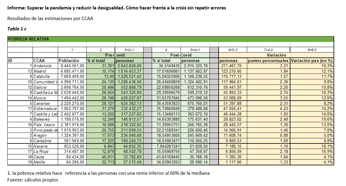 Concretamente, en Andalucía, la situación es la siguiente según la ha facilitado también un informe de la citada Organización, Superar la pandemia, reducir la desigualdad. Cómo hacer frente a la crisis sin repetir errores, en relación con la pobreza relativa en nuestro país: