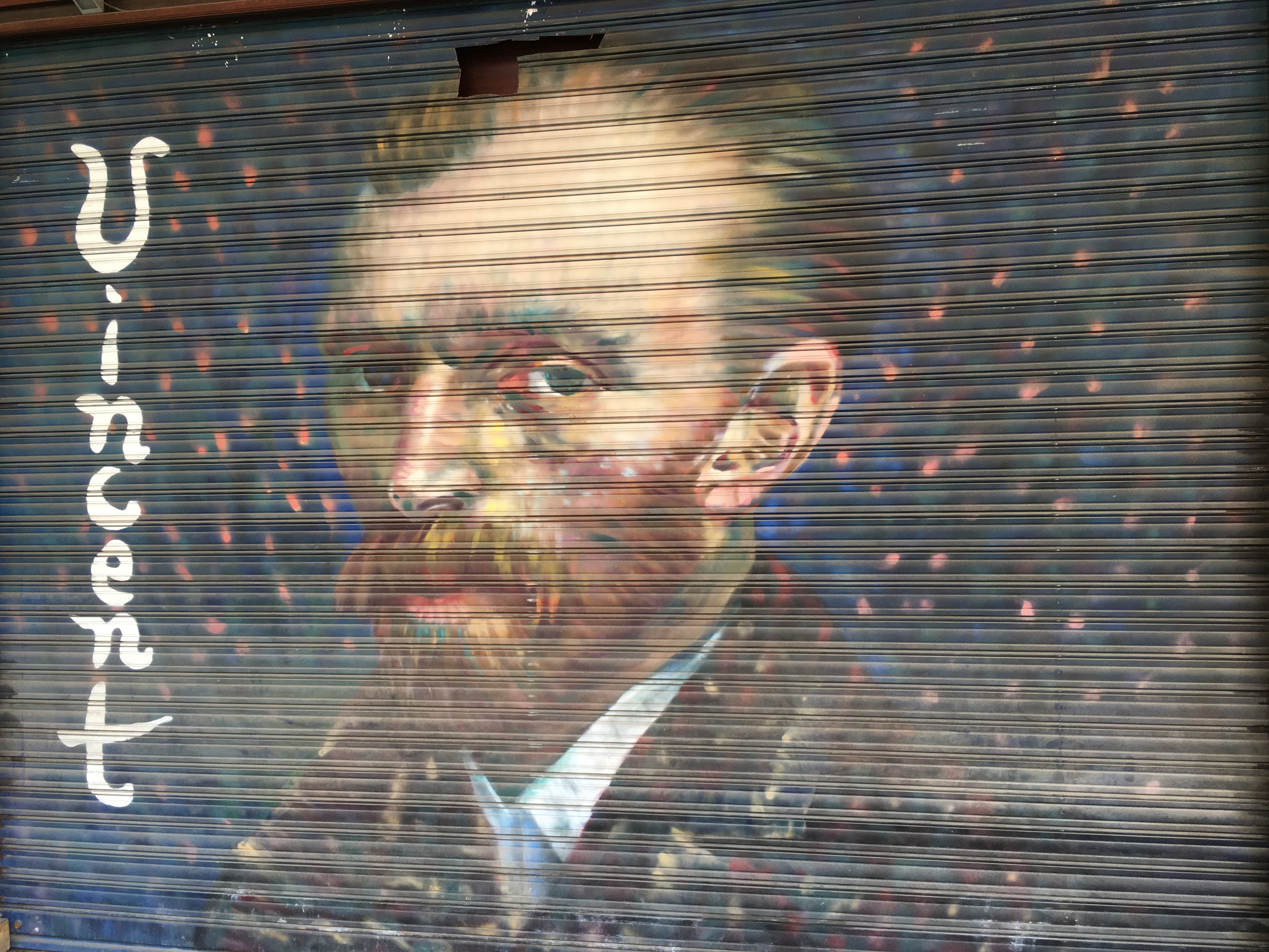 Esta mañana me he cruzado con la mirada inquietante de Van Gogh, en un retrato realizado sobre un cierre metálico de una cafetería y bar de copas en Sevilla, en un barrio próximo al mío. Inmediatamente, lo he recordado una vez más en este cuaderno digital porque su presencia siempre da un valor especial a estas páginas. Repaso algunas de las palabras que escribí en su momento y me reafirmo en todas ellas. Decía en 2015 que “siempre me ha sorprendido la pintura de Van Gogh, sus trazos finos y gruesos. En enero de 2005 finalicé la copia de un cuadro suyo, La cosecha (en La Crau), como primer trabajo del taller municipal de pintura en el que estaba inscrito ese año, pintado a propuesta mía por el recuerdo vivo de un libro precioso que tenía en mi biblioteca sobre el autor y publicado en 1990, año en el que se cumplía el centenario de su muerte y porque creí que era importante copiarlo en trazos que consideré siempre fáciles para un principiante. Craso error. Aquella sobrecubierta del libro, en la que figuraba también el cuadro, había sido clave para comprender mejor a este complejo artista, al que conocí a través del trigo cosechado en Arlés, el pajar, las escaleras, el carro central que tanto cuidé, un hombre con una horca y el fondo de montañas de colores púrpura y azul, el Montmajour, con un fondo turquesa de cielo bastante sobrecogedor”.