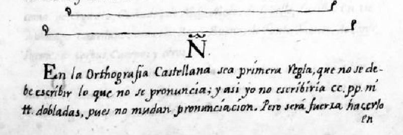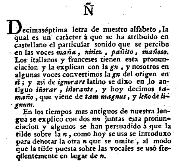 En este breve análisis de la letra “Ñ”, hay que señalar (no “sennalar”) que aparece por primera vez en el grupo 1 de diccionarios de los siglos XV al XVIII, donde figura una obra atribuida a Francisco del Rosal, que se describe con el siguiente detalle y literalidad en el Nuevo Tesoro Lexicográfico de la Lengua Española (NTLLE, ROS M 1611, Pag: 451s.): “Origen y etymología de todos los vocablos originales de la Lengua Castellana. Obra inédita de el Dr. Francisco de el Rosal, médico natual de Córdova, copiada y puesta en claro puntualmente del mismo manuscrito original, que está casi ilegible, e ilustrada con alguna[s] notas y varias adiciones por el P. Fr. Miguel Zorita de Jesús María, religioso augustino recoleto”. Este dato es de indudable interés porque habría que esperar hasta la edición de 1803 del Diccionario de la lengua castellana compuesto por la Real Academia Española, “reducido a un tomo para su más fácil uso”, para recoger el lema referido a la letra “eñe”: