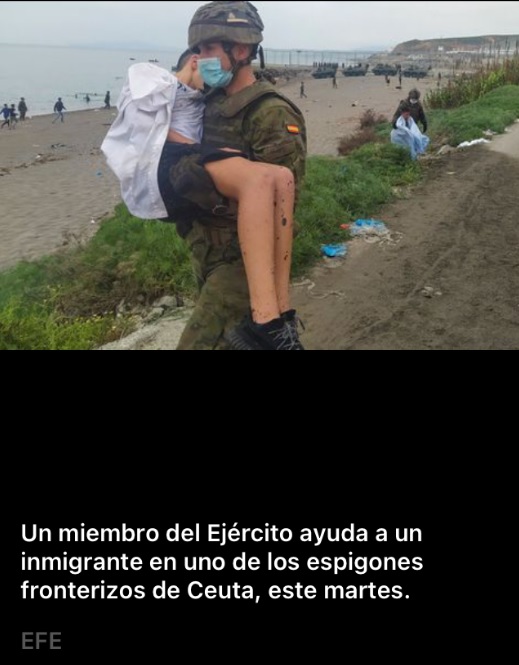 Lo que está ocurriendo con la llegada masiva de marroquíes a Ceuta es fiel reflejo de la situación mundial de los nadies, tan bien descritos por Eduardo Galeano: los hijos de nadie, los dueños de nada. / Los nadies: los ningunos, los ninguneados, / corriendo la liebre, muriendo la vida. Es un problema de gran alcance político, pero sobre todo es un problema de este mundo al revés que se ve reflejado en la imagen que encabeza estas líneas, un soldado del ejército que lleva en brazos a un adolescente marroquí rescatado al llegar exhausto a una de las orillas de Ceuta, cruzando a nado hacia una tierra de promesas.
