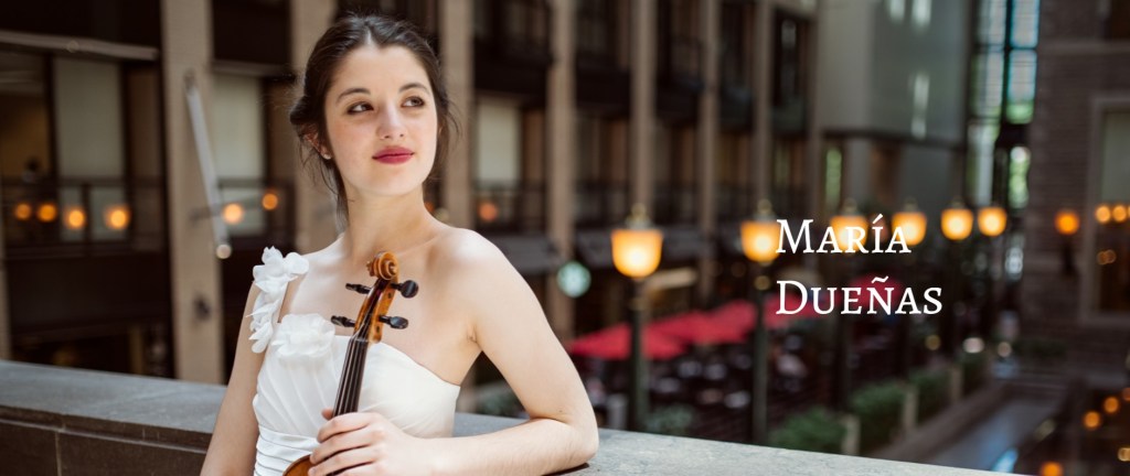 Gracias a su biografía oficial, verdaderamente asombrosa, sabemos que María Dueñas nació en Granada, España (Diciembre, 2002) y que “se trasladó a Alemania tras ganar con 11 años la convocatoria para estudios en el extranjero de Juventudes Musicales de Madrid, conseguir la beca Wardwell de la Fundación Humboldt y gracias al apoyo de Industrias Kolmer. Actualmente, Dueñas estudia con el distinguido pedagogo Boris Kuschnir en la Universidad de Música y Arte de Viena, así como en la Universidad de Arte de Graz, formación que se hace posible gracias a la Beca de AIE para instrumentistas en el extranjero. Cabe destacar, que su crecimiento musical recibió un gran impulso tras ganar la convocatoria del concurso de instrumentos en Hamburgo y recibir en préstamo un violín Nicolo Gagliano de 1734. A pesar de su juventud, su actividad concertista le ha llevado a las mejores salas de conciertos de Europa, incluyendo su debut a los quince años en la Sala Dorada del Musikverein de Viena, la sala Tchaikovsky de Moscú bajo la dirección de Vladimir Spivakov y la Orquesta Nacional Rusa, un debut seguido por una exitosa gira por España. La sala Filarmónica de Berlín, la Orquesta Sinfónica de San Francisco con Marek Janowski, el Teatro Monumental con RTVE y Caballé Domenech, el Auditorio Nacional de Madrid con los Virtuosos de Moscú y la OCNE con Jaime Martín, la Orquesta Filarmónica de Estonia con Mihhail Gerts, la Orquesta Sinfónica del Principado de Asturias con Ari Rasilainen, la Orquesta Sinfónica de Lahti con Dima Slobodeniouk, l’Auditori con la Orquesta Sinfónica de Barcelona y Cataluña y la Orquesta Filarmónica de Luxemburgo y Gustavo Gimeno. Su paso por la Elbphilharmonie de Hamburgo dio lugar a la emisión del CD So klingt die Zukunft, producido por el Deutsche Stiftung Musikleben y la NDR. Festivales de renombre internacional han contado con la presencia de María, tales como el Festival Mecklenburg-Vorpommern, el Rheingau Festival en una producción junto a Pablo Ferrández y Pablo Sáinz-Villegas, Schloss Elmau junto a Itamar Golan, el Festival Internacional de Música y Danza de Granada dirigida por Juanjo Mena y la Orquesta Sinfónica de Galicia o el Festival Internacional de Colmar, donde rindió homenaje a Claudio Abbado. Alumna Residente de la Academia Verbier en 2017, María regresó en 2019 al Festival como artista invitada, ofreciendo su recital debut con Ken Noda. Le Figaro celebró su actuación como la de “una niña prodigio, cuya expresividad y virtuosismo encantaron al público.” Asimismo, su participación con la Orquesta Filarmónica de St. Petersburgo, bajo la dirección de Vassily Sinaisky, en el Festival de Invierno de St. Petersburgo ha supuesto otro hito importante en su carrera. El espíritu sediento de aprendizaje de María le lleva a adentrarse en el mundo de la composición y a formar el Hamamelis Quartett, premiado en el Concurso Fidelio de Música de Cámara. Su obra para piano Farewell fue galardonada en el Concurso de Composición Robert Schumann. El compositor Jordi Cervelló ha compuesto recientemente varios caprichos para violín dedicados a María, estrenados durante su recital en Girona con Evgeny Sinaisky. En la presente temporada destaca su debut con Manfred Honeck por partida doble con la Filarmónica de Gotemburgo y la Orquesta Sinfónica de Pittsburgh, en la Elbphilharmonie de Hamburgo así como su estreno con la Orquesta Sinfónica de Lucerna bajo la dirección de Michael Sanderling”.