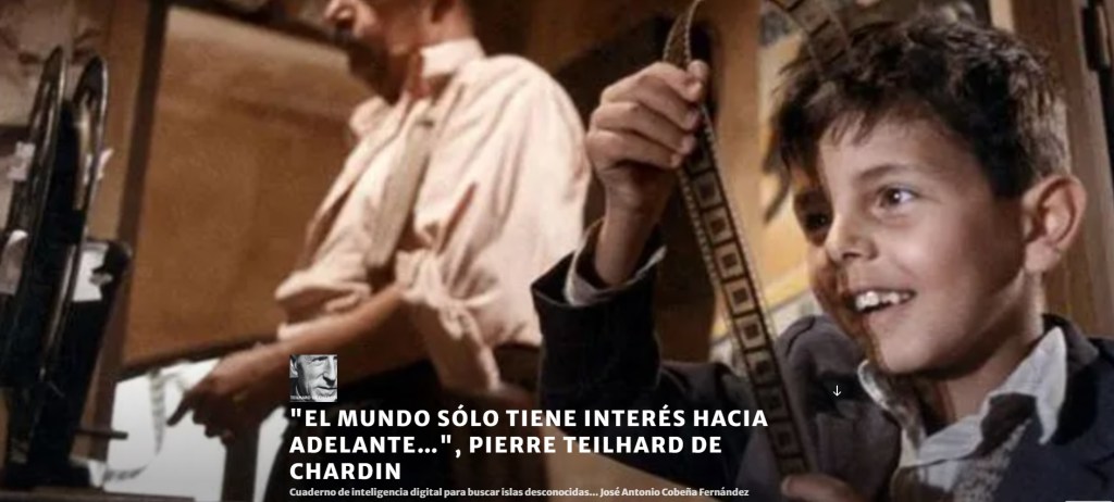 Mi vida ha sido también una película sin fin, de muchos géneros en uno solo: vivir apasionadamente. Me sentí reflejado en Cinema Paradiso de principio a fin, por el amor al cine, porque siendo muy niño hacía mis propias películas con dibujos animados en papel, impregnándolos en aceite que, una vez secos, los unía y pasaba por rodillos laterales de un escenario, también hecho a mano, para imprimirles movimiento a demanda, iluminados por una bombilla incandescente. Más o menos, observando aquel descubrimiento mágico con la cara de Totó, mi querido protagonista de la película de verdad, que he recogido en la imagen que preside estas líneas. También, porque seguí siempre el consejo de su gran amigo Alfredo cuando decía al niño que amaba tanto el cine, que debía salir de sí mismo para buscar islas desconocidas, las que describía extraordinariamente Jose Saramago en su cuento homónimo, “La isla desconocida”. En aquella escena memorable de la estación, Alfredo, ya ciego por el incendio del cine, le dice en un susurro inolvidable a Totó: “La vida es más difícil… Márchate…, el mundo es tuyo, … no quiero oírte más, solo quiero oír hablar de ti… Hagas lo que hagas, ámalo”. Le ayudó a salir de su zona de confort y nunca he olvidado aquellas escenas ni aquellas palabras. Todo un símbolo: hagas lo que hagas, ámalo.