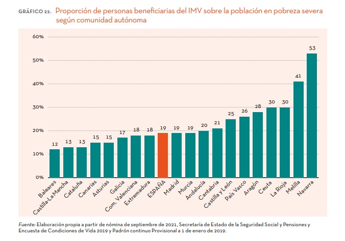 Como una imagen vale más que mil palabras, reproduzco a continuación el gráfico que indica la proporción de personas beneficiarias del IMV sobre la población en pobreza severa según comunidad autónoma, donde se puede comprobar que la Comunidad Autónoma a la que pertenezco, Andalucía, sólo alcanza en la actualidad la obtención del IMV a un 20% del total de prestaciones solicitadas en relación con la pobreza severa, porcentaje que se comenta por sí sólo y que debería llevar a al Gobierno a una reflexión sobre las condiciones de solicitud de las mismas, cuestión que aborda el informe en el apartado dedicado al análisis de IMV en la actualidad, al constatarse una cobertura insuficiente y con lagunas específicas entre perfiles, tipos de hogares y situaciones de exclusión social, un desconocimiento muy alto de la existencia de este derecho subjetivo, como bien lo trata el informe: “A la vista de los datos de solicitantes, podemos afirmar que la respuesta social a la medida es, efectivamente, mayor desde el público al que estaba destinada, si bien, por desinformación, frenados por no cumplir los requisitos tan específicos a priori, o por otras cuestiones relacionadas con las dificultades burocráticas y tramitación, solo una cuarta parte de las familias en pobreza severa son solicitantes”.