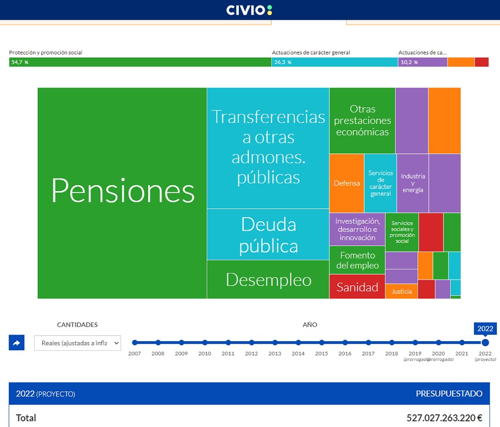 Es muy importante entrar en esta página web de la Fundación CIVIO para comenzar a comprender bien las bases presupuestarias que asientan o no la democracia en este país y los pilares económicos, no inocentes por cierto, que la sustentan a partir de una pregunta transcendental, ¿Dónde van mis impuestos?, con tres proyecciones políticas esenciales, Ingresos, ¿Cómo se gasta? Y ¿En qué se gasta? Acceder a todos los datos es posible y CIVIO nos ofrece esta oportunidad de emitir juicios bien informados, la base de toda evaluación que debemos hacer como ciudadanos responsables. Creo que se comprende bien por qué la transparencia basada en los datos públicos masivos correctamente utilizados, como este Proyecto de Presupuestos Generales del Estado para 2022, se convierte en un claro objeto de deseo que se puede alcanzar si se implantara en este país una política digital con visión de Estado y con una proyección democrática y de coparticipación en el ecosistema público digital de las Comunidades Autónomas.