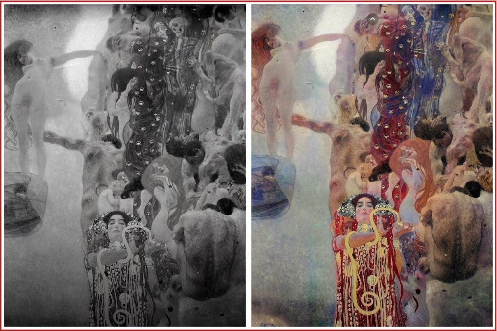 Tal y como se afirma en el proyecto citado, “La actitud visionaria de Klimt inspiró estas nuevas versiones recoloreadas de las Pinturas de las facultades, creadas con aprendizaje automático y vistas por primera vez como parte del proyecto «Klimt vs. Klimt». Para conocer bien el texto y contexto de los sucedido con estas obras y con otras que fueron llevadas al castillo de Immendorf en un intento de protegerlas de los avatares de la guerra y de la invasión nazi, recomiendo ver y leer con detalle el apartado que este proyecto dedica a lo que llama “El misterio de las obras quemadas de Klimt”. Lo que verdaderamente llama la atención en la aproximación a estos cuadros, gracias a la revolución digital, de los que quedan sólo muestras de fotografías en blanco y negro, es el uso intensivo de la inteligencia artificial, mediante el aprendizaje automático, para darles nueva vida. Hay que partir de que “en 1900, a Klimt se le encargó que pintara representaciones alegóricas de Medicina, Jurisprudencia y Filosofía para el techo del aula magna de la Universidad de Viena. La universidad rechazó las obras en 1907 por motivos de «pornografía» y «exceso pervertido». Pasaron a manos de coleccionistas privados y luego fueron destruidas por oficiales de las SS durante la Segunda Guerra Mundial. Durante décadas, sobrevivieron solo en fotografías en blanco y negro. Hasta ahora…”.
