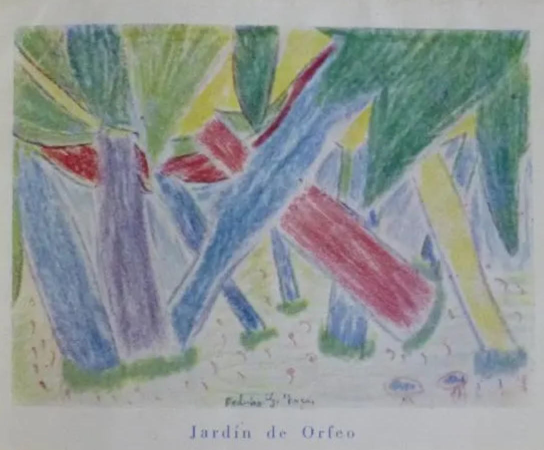 Recomiendo la lectura de los siete poemas en este enlace, que corresponde a la publicación oficial, así como la visualización de los dos dibujos, en el orden que figuran en el ejemplar de la revista citada, Cuadernos Hispanoamericanos, aunque agrego a continuación el segundo dibujo, Jardín de Orfeo, porque no figura en el enlace citado, que corresponde a la página 19 del original: