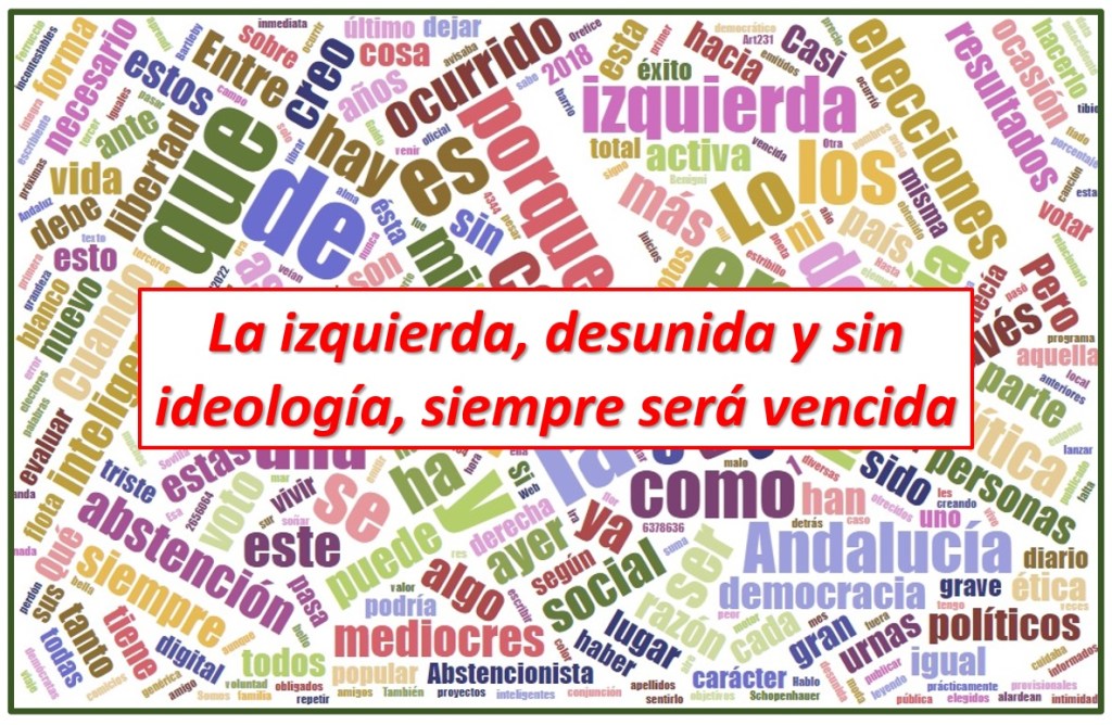 En segundo lugar, hay que analizar lo que ha ocurrido con la derrota, sin paliativos, de la izquierda global. Ya lo experimentamos en la convocatoria a estas elecciones en 2018 y se ha vuelto a repetir la historia con lo que pasó ayer, pero con resultados todavía más adversos. ¿Qué pasa en la izquierda de Andalucía? Hablo en presente porque creo que es necesario hacer un examen profundo de la situación actual de la denominada “izquierda” (para entendernos) y no quedarnos solo en lanzar ataques furibundos sobre todo el espectro del centro y de las derechas, como una mal entendida defensa para justificar lo ocurrido ayer. La democracia nos enseña que hay que respetar de forma casi reverencial el resultado de las urnas. Las razones que han llevado a la derrota de la izquierda deben ser expuestas siempre de forma muy clara y de la forma más homogénea posible, impulsando sobre todo la transformación social, no solo los cambios, cuidando con esmero a los más débiles para alcanzar entre todos otro mundo posible. La fractura de la izquierda no ha hecho otra cosa en los últimos años que entorpecer con su división esta noble tarea de transformación. Así de claro y alto. Otra cosa es conformarnos con lo ocurrido y dejar que todo siga igual. Salvo error por mi parte en el rastreo técnico que he efectuado para evaluar lo ocurrido con la izquierda, creo que todavía no se ha hecho en Andalucía un examen a fondo de las circunstancias de texto y contexto en torno a las elecciones de 2018 y sus consecuencias, porque de aquellos barros vienen hoy estos lodos de fracaso y abstención. La crisis global de la izquierda data ya de hace varios años, quizá demasiados, donde se han ignorado continuamente las señales de falta de identidad de la militancia activa y pasiva en torno al espectro de la denominada izquierda. Lo ocurrido ayer ha sido el resultado flagrante, a modo de crónica, de un desastre anunciado, por el rebosamiento de la grave fractura de la izquierda. ¿Por qué un absentismo también de la izquierda tan abrumador y lejano del derecho a votar? Creo que, fundamentalmente, porque hay una ausencia pavorosa de ideología política en general y en la izquierda en particular, lo que conlleva que no existan programas políticos acordes con la realidad social a la que el Gobierno debe servir, respetando siempre el interés general y, por supuesto, carencia clamorosa de líderes que lleven adelante estos programas, instalándose masivamente en la sociedad la “mediocracia”, el gobierno de los mediocres, que nos invade por tierra, mar y aire y a la que he dedicado bastantes artículos en este cuaderno digital.