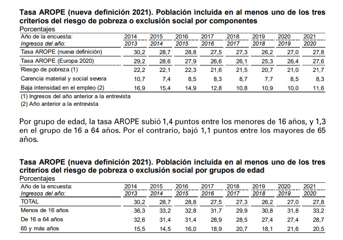 Es muy importante considerar un detalle técnico de la encuesta que tiene unas derivadas muy claras en los resultados obtenidos y que creo conveniente conocer. Se trata de la nueva definición de la tasa de riesgo de pobreza o exclusión social, AROPE; (por sus siglas en inglés, At Risk Of Poverty or social Exclusion), «que se creó en 2010 a efectos de medir la pobreza relativa en Europa ampliando el concepto de la tasa de riesgo de pobreza, que solo contempla los ingresos. La tasa AROPE se ha venido construyendo con la unión de la población que se encuentra en riesgo de pobreza, o con carencias materiales o con baja intensidad en el empleo. En 2021 se ha introducido un cambio metodológico que ha afectado a dos de sus tres dimensiones. Así, la tasa AROPE (nueva definición 2021) se define como aquella población que está al menos en alguna de estas tres situaciones: