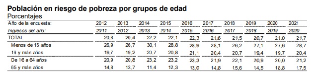 Sólo un dato más en relación con la población en riesgo de pobreza, que mide fundamentalmente la desigualdad, porque «no mide pobreza absoluta, sino cuántas personas tienen ingresos bajos en relación al conjunto de la población. En 2021 (teniendo en cuenta los ingresos de 2020) el porcentaje de población con ingresos por debajo del umbral de riesgo de pobreza (la llamada tasa de riesgo de pobreza) se situó en el 21,7% de la población residente en España, frente al 21,0% del año anterior».