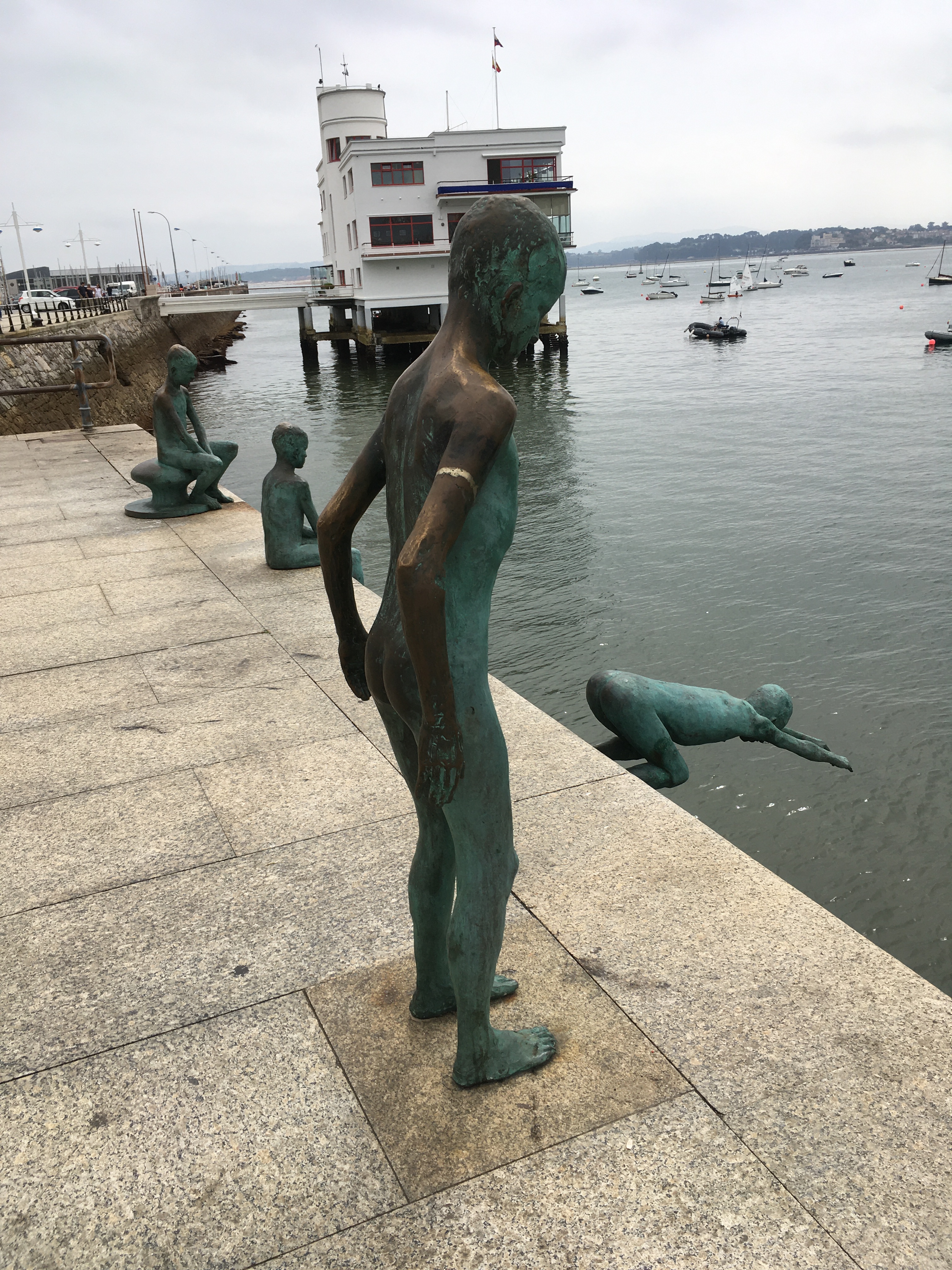 Con este buen sabor de boca cultural, localicé en el Paseo de Pereda, concretamente en el Muelle de Calderón, una obra escultórica de conjunto, inaugurada en 1999, que tenía especial interés en conocer: los raqueros o raquerucos, en expresión cántabra correcta. Allí estuvimos contemplando un pedazo de la historia de Santander, unos niños en bronce sorprendentemente inmovilizados, obra de José Cobo. Al preguntar por su localización exacta, una persona entrada en años nos dijo dónde estaban y con orgullo patrio nos confesó que él había sido uno de esos niños, un “raqueruco”, que su historia no es como nos lo cuentan, que no eran gente de mal sino lo suficientemente traviesos como para recoger las monedas que les tiraban los paseantes de aquel lugar del puerto junto al mar de entonces, tirándose al agua para ver quien ganaba más dinerillo en esa sana competición infantil. Lo escuchamos con respeto reverencial aunque yo había leído en una obra de José María de Pereda, que «eran niños marginales que vivían la picaresca del puerto. Desnudos o semidesnudos se lanzaban a las aguas de la bahía a recoger monedas que lanzaban los viajeros». El tiempo huye de algunas realidades, aunque la cartela indicativa del grupo escultórico decía textualmente que los raqueros eran “unos personajes típicos santanderinos descritos por José María de Pereda (Polanco, 1833-1906), que en los siglos XIX y XX frecuentaban las machinas [grúa de grandes dimensiones en los puertos] y acostumbraban a darse un cole [chapuzón] en Puertochico, buceando en las aguas de la Bahía para recoger las monedas que los curiosos les lanzaban”. Vivir para leer en el tiempo, esa es la cuestión.