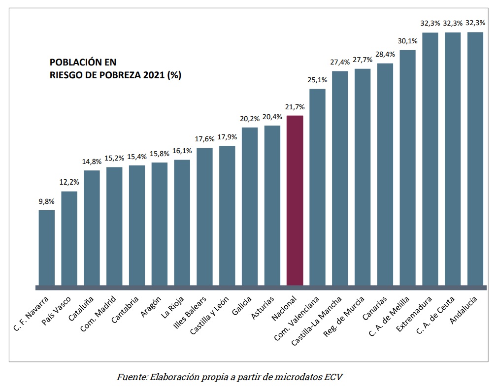 Cuando se analiza en el informe la pobreza en las Comunidades Autónomas, las principales conclusiones obtenidas en el análisis del AROPE también son aplicables a la tasa de riesgo de pobreza, es decir, la desigualdad territorial es muy elevada, existe una clara diferenciación norte-sur y un deterioro en función de los objetivos de la Agenda 2030. La distribución regional de la tasa de riesgo de pobreza en 2021 y los datos para comparar la evolución con respecto al año 2008, 2015 y 2020 se pueden verificar en los gráficos del informe: ”En primer lugar, tal como sucede prácticamente todos los años, en 2021, Andalucía, Extremadura y Canarias mantienen las tasas más altas de población en riesgo de pobreza, con cifras entre el 32,3% y el 30,1 %. Por otra parte, Navarra con el 9,8% y País Vasco, con el 12,2% son las de mejor desempeño: