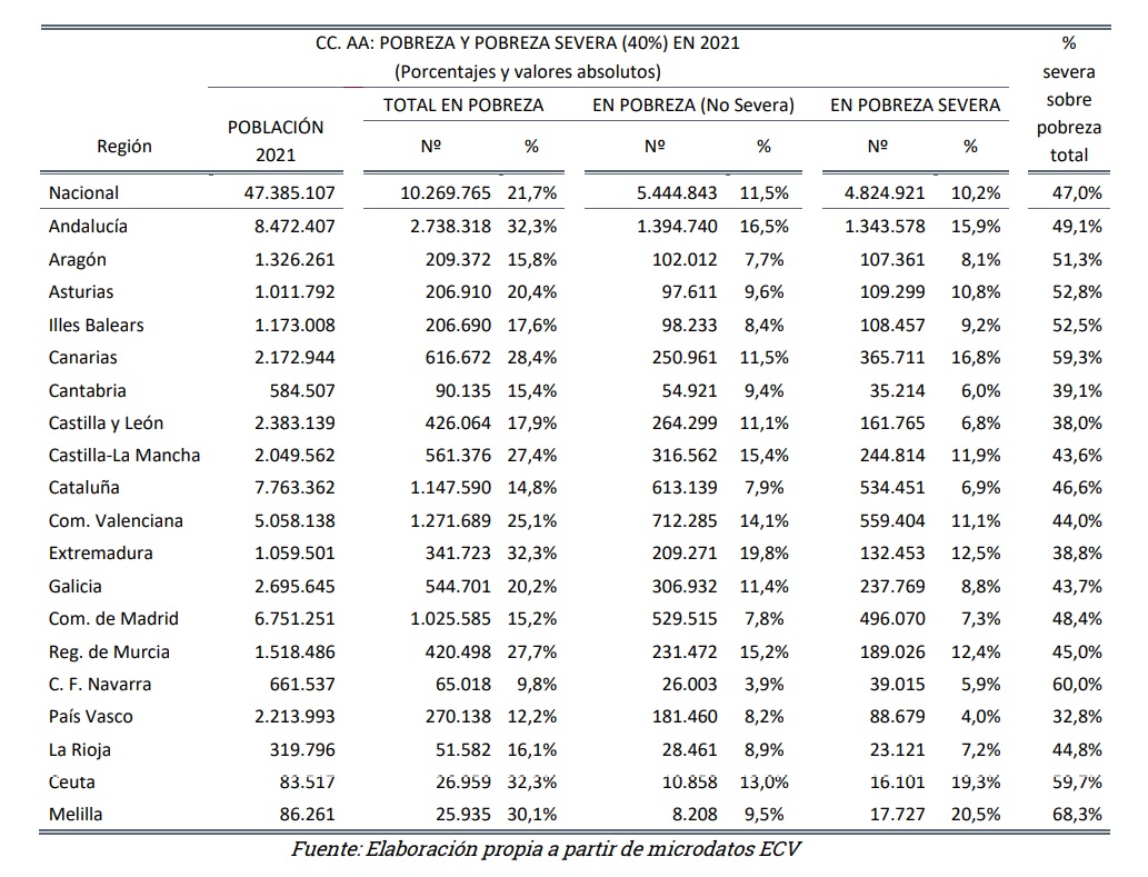 La pobreza severa es otra realidad lacerante: “el 47 % de las personas pobres están en pobreza severa, esto es, casi la mitad de las personas pobres viven en hogares con un ingreso inferior al 40% de la renta mediana nacional que, en términos absolutos, equivale a 530 € mensuales por unidad de consumo. Con respecto al año pasado, la cifra ha crecido en 2 puntos porcentuales (45 % en 2020) lo que evidencia un incremento en la intensidad de la pobreza; esto es, para este año no solo hay más personas pobres sino que son aún más pobres de lo que lo eran el año anterior. En la actualidad, el 10,2% de la población española está en pobreza severa, cifra que es siete décimas superior al 9,5% registrado en 2020. Sin embargo, este moderado incremento oculta importantes variaciones a nivel regional. Éste último año, la tasa de pobreza severa ha aumentado en 12 comunidades autónomas. Destaca especialmente el incremento en La Rioja (3,2 puntos porcentuales, 81 % de crecimiento), en Baleares (3,2 puntos porcentuales, 52 % de crecimiento) y en Andalucía (4,3 puntos porcentuales, 37 % de crecimiento). Por otra parte, la pobreza severa se ha reducido intensamente en Cantabria (-2,7 puntos porcentuales; -31 %), Cataluña (-2,3 puntos porcentuales; -25 %) y la C. Valenciana (-2,3 puntos porcentuales; 17,5 %), y más moderadamente en Asturias y Galicia.
