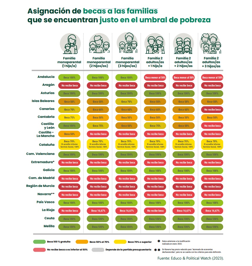 En el apartado final de conclusiones y recomendaciones, se resaltan los diez enunciados citados anteriormente, a titulo de “recetas” imprescindibles para un abordaje efectivo, justo y equitativo ante la situación actual que deja bastante que desear, sobre todo por lo injusto que es el desequilibrio territorial actual en el país, donde en relación con asignación de becas a las familias que se encuentran justo en el umbral de pobreza, se observa el liderazgo absoluto en el País Vasco, Navarra y Galicia, con el cien por cien de su implementación y la realidad de Comunidades como Andalucía, por su población infantil tan alta, donde se da esta realidad de asignación en las situaciones de Familias monoparentales con hijos, hasta 3, pero no en las de 2 adultos/as + 1, 2 o 3 hijos/a, reduciéndose en estos casos la citada asignación de becas comedor tan sólo al 50%: “En las CC. AA. en las que el umbral autonómico es superior al umbral estatal, hemos tomado para construir la infografía [página 23 del informe] el valor más alto, o sea aquel que beneficia a más niños y niñas en situaciones precarias (Aragón, Asturias, Cantabria, Castilla y León, Cataluña, Com. Madrid, Navarra y País Vasco). Desde Educo creemos que debe utilizarse el más alto, es decir aquel que beneficie a más niños y niñas en situaciones precarias. Siempre hay que construir políticas a favor de la infancia”.