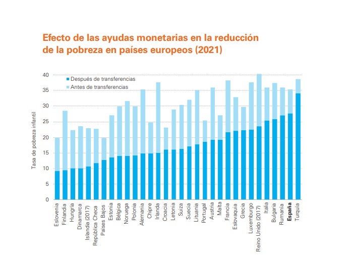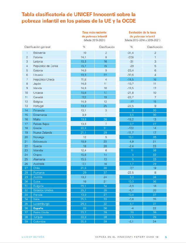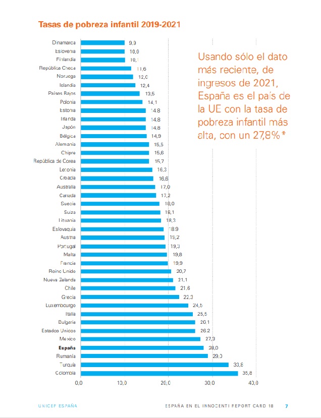 Respecto de la situación actual de la pobreza infantil, el informe señala que “se pueden remarcar algunos aspectos relevantes en relación con España, que se sitúa en la parte final de la clasificación, solo por encima de Rumanía, Turquía y Colombia. En este apartado del RC se analiza no solo la pobreza monetaria (usada para la tabla clasificatoria) sino también la privación material y la pobreza subjetiva como parte del concepto de “pobreza multidimensional”, es decir, usando sólo el dato más reciente, de ingresos de 2021, España es el país de la UE con la tasa de pobreza infantil más alta, con un 27,8%: