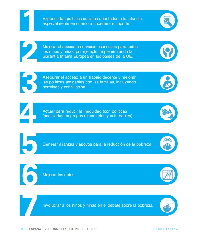 Por último y quizás la parte más importante por señalar acciones de presente y futuro, se exponen en el infirme siete recomendaciones y cinco propuestas de actuación para abordar la pobreza infantil en esta legislatura, a la luz de los datos expuestos: