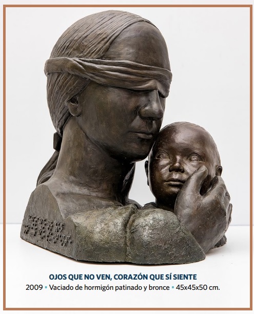Entre la selección de obras expuestas, me impresionó una de Mercedes Rodriguez Elvira (Santander, 1950), en la que la cabeza de la madre está realizada en cemento armado patinado, y la del niño en bronce, con un título conmovedor, Ojos que no ven, corazón que sí siente, que ella presenta con palabras que llevan su sentimiento dentro: “Concebí Ojos que no ven, corazón que sí siente, como homenaje a los sentimientos de las personas invidentes. La idea más concisa de la maternidad, me pareció la mejor para tal fin. Para ello adapté un retrato de uno de mis hijos pequeños e imaginé la caricia amorosa de una madre invidente, rozando su sien; para lo cual, vendé sus ojos y escribí en braille, el título en la parte inferior de la obra“.