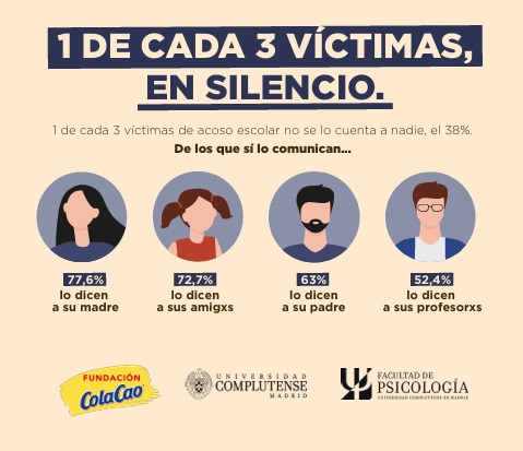 • 1 de cada 3 víctimas de bullying afirma no explicárselo a nadie: el miedo y no querer preocupar a sus familiares, los dos motivos principales.