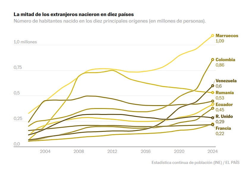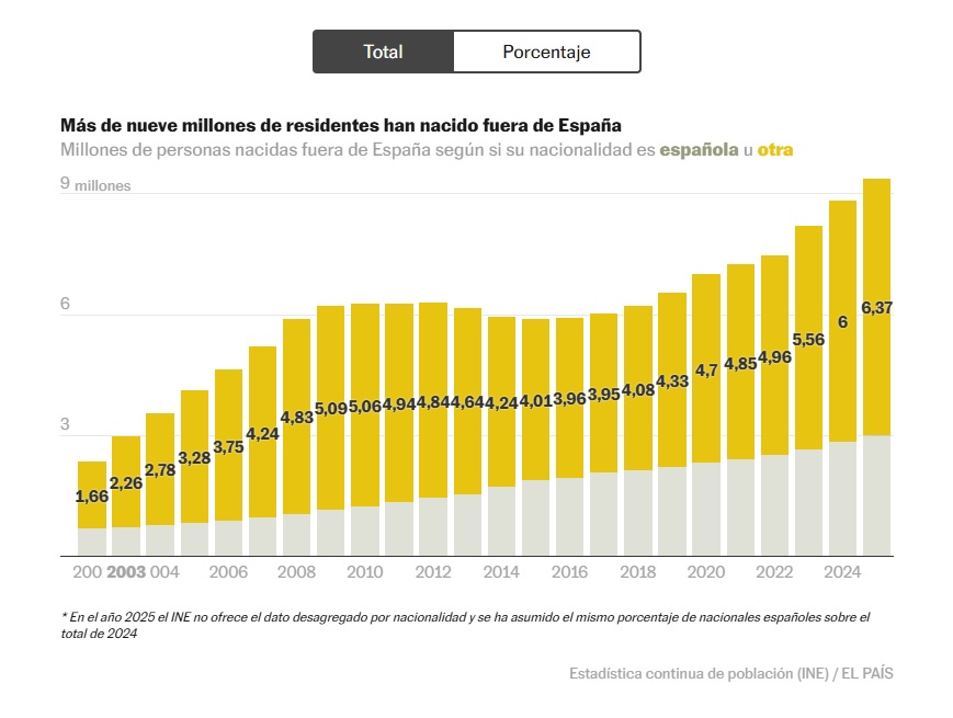 Para empezar, “en España viven 9,3 millones de personas nacidas en otro país, casi uno de cada cinco habitantes. De ellas, más de tres millones tienen nacionalidad española —alrededor del 30%—, mientras que seis millones conservan su nacionalidad de origen”. Estos datos suponen que los inmigrantes son en la actualidad el 19% de la población total.
