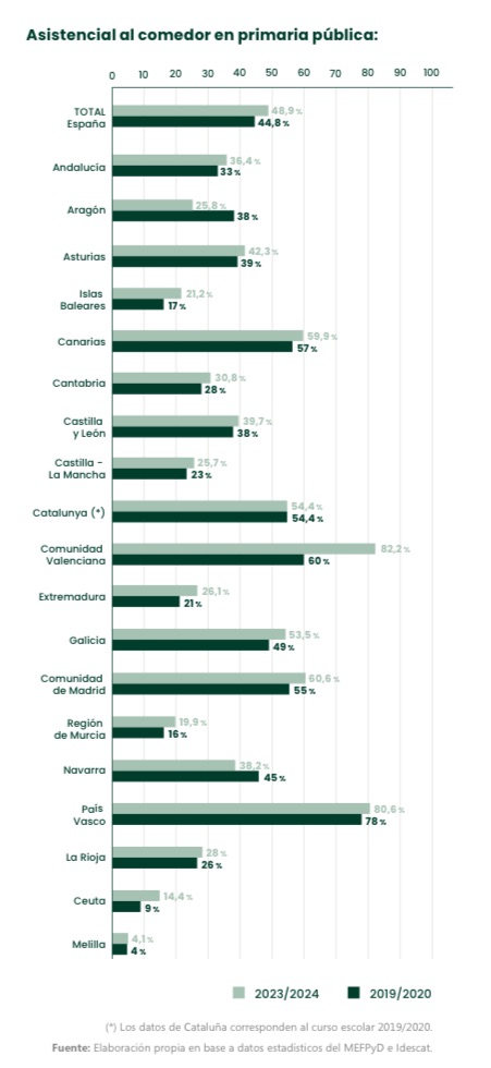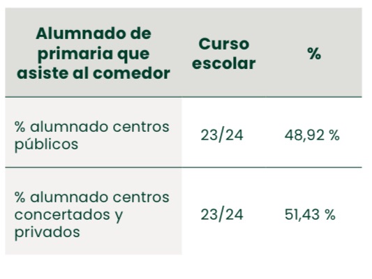 En su introducción se afirma que “En este informe analizamos los datos estadísticos con el objetivo de ver la situación y avances del comedor escolar. Más de 2,5 millones de niños, niñas y adolescentes comen cada día en sus escuelas. Sin embargo, solo son el 48,9 % del alumnado de primaria y el 2,9 % de la educación secundaria obligatoria (ESO) en los centros públicos. Muchas familias dependen de las becas para poder enviar a sus hijos e hijas al comedor escolar. Aunque la inversión en becas ha crecido el último curso en casi 110 millones de euros, el 56,2 % de la infancia en riesgo de pobreza no recibe una beca comedor”.