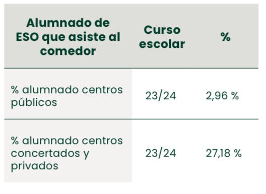 Me sigue llamando la atención conocer que “la brecha principal se da, sin lugar a duda, en el paso de primaria a secundaria: “Solo el 2,96 % de quienes van a institutos públicos asistirán al comedor. Y aunque en la escuela privada y concertada el porcentaje es mayor (27,18 %), tampoco ofrece el espacio de alimentación y educación que se necesita para toda la adolescencia. Los datos son muy similares a los que presentábamos en 2022 para el curso 2019/2020 (2,9 % y 25,2 % respectivamente), lo que muestra que la situación no se está abordando”.