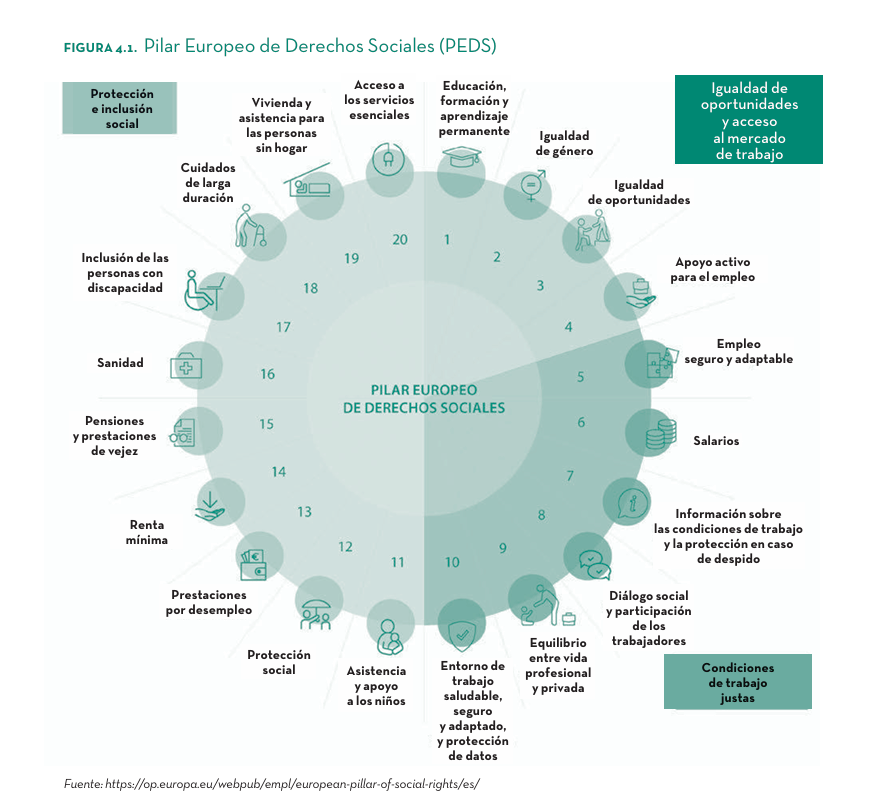 El cuarto capítulo aborda lo que para mí es nuclear en la situación política actual, el acoso y derribo del Estado de Bienestar, profundizando en las heridas abiertas desde hace ya varios años, así como la incorporación en tromba del llamado cuarto pilar de ese Estado, tomando en consideración la importancia de respetar el Pilar Europeo de Derechos Sociales (PEDS): «[…] un Estado de Bienestar en tensión pese al respaldo ciudadano: presiones geopolíticas, tendencias privatizadoras, rearme europeo y debilidad fiscal. El tercer sector constituye una infraestructura masiva pero invisible, con dualización entre organizaciones bien dotadas y microentidades con recursos insuficientes. La provisión mercantil complementaria refuerza desigualdades al beneficiar a quienes disponen de mayor capacidad económica. La sostenibilidad se ve amenazada por la polarización ideológica y