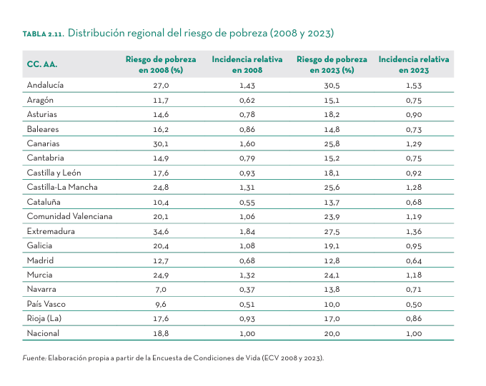 transformada desde sus cimientos. La estructura de clases tradicional se ha fragmentado radicalmente, con una erosión significativa de las clases medias y la práctica desaparición de la identidad obrera tradicional. Esta atomización social ha generado una proliferación de identidades múltiples que dificultan la construcción de proyectos comunes y solidaridades colectivas». En el segundo capítulo se señala «la cristalización de la desigualdad estructural. La precariedad laboral emerge como fenómeno sistémico, mientras la polarización del empleo —crecimiento de ocupaciones extremas y debilitamiento de posiciones intermedias— se acelera con la inteligencia artificial, planteando retos urgentes que amenazan con ampliar la fractura social. La desigualdad salarial se revela estructural, con brechas que se enquistan especialmente entre generaciones, rompiendo expectativas de progreso».