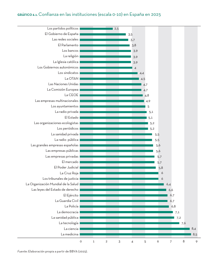 comunitario, con financiación insuficiente que perpetúa feminización y precariedad. La vivienda exige una respuesta estructural que priorice derecho frente a especulación. Las pensiones necesitan un pacto intergeneracional más allá de ajustes técnicos». El quinto capítulo aborda otra realidad flagrante: el ocaso de la democracia en nuestro país, no inocente por cierto, junto a la desafección política, dan lugar a «[…] la erosión de la confianza social y política. La democracia se percibe como ineficaz y desconectada, erosionando el compromiso cívico. Corrupción persistente, incapacidad para resolver problemas estructurales y sentimiento de no ser escuchados refuerzan la desconfianza. Existe un contraste inquietante: amplio respaldo a servicios públicos no siempre se traduce en disposición a financiarlos, lo que evidencia la fractura en el principio de reciprocidad». Según recoge el Informe en este capítulo, «Las noticias falsas fragmentan el espacio público y erosionan la verdad compartida, mientras las plataformas digitales generan aislamiento en lugar de conexión, cuestionando fundamentos relacionales de la democracia deliberativa».