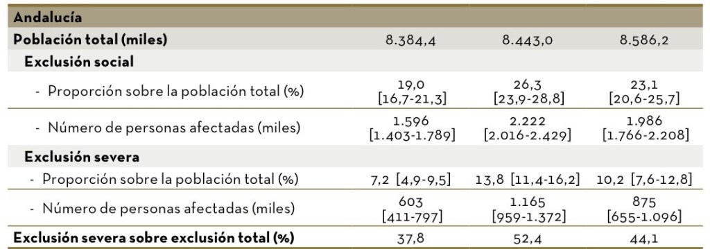 5. Los grupos sociales más afectados por la exclusión social: personas en hogares encabezados por alguien que busca empleo y en hogares en situación de pobreza severa: “los perfiles o grupos sociales más afectados por la exclusión en Andalucía son dos: las personas en hogares encabezados por alguien que busca empleo (el 85,4% de todas las personas en estos hogares se encuentran en situación de exclusión social) y las que pertenecen a un hogar en situación de pobreza severa (83%)”.