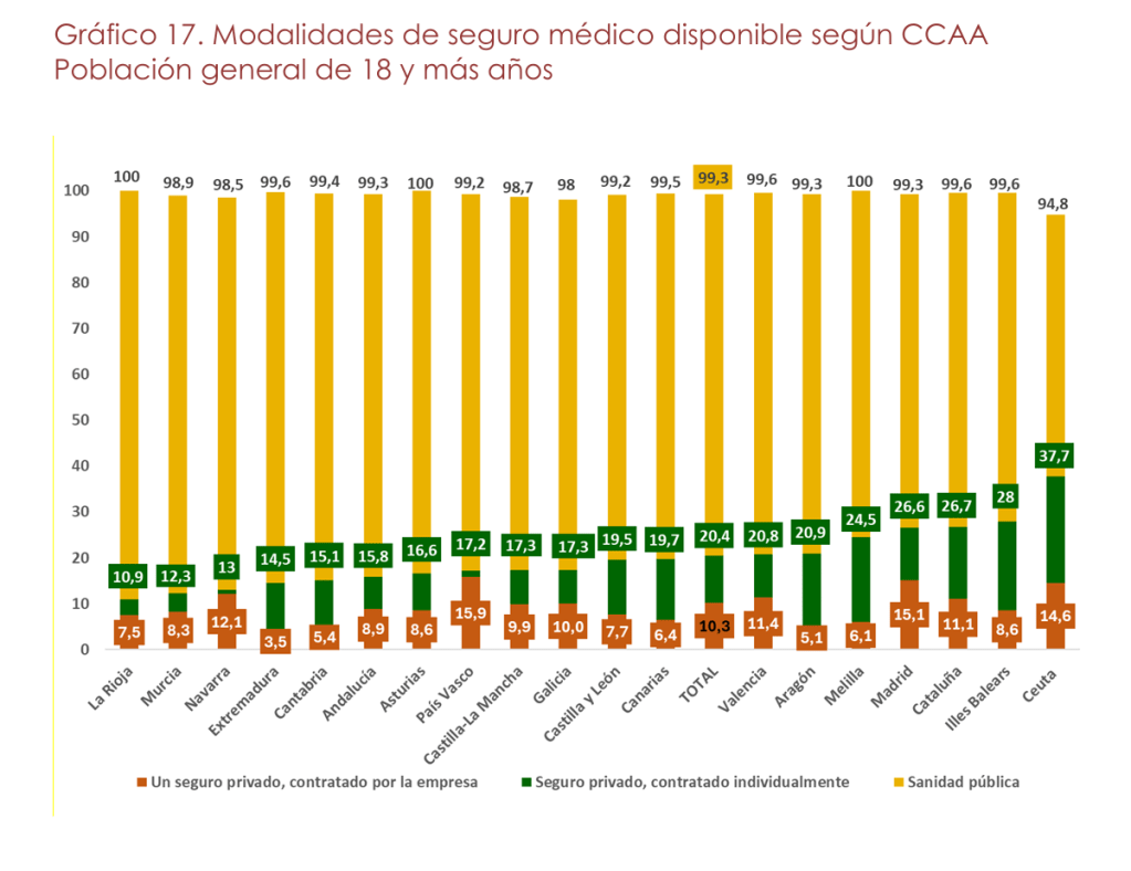 de varias modalidades de seguro por lo que no pueden sumarse directamente al existir solapamientos entre categorías. En la mayoría de las CCAA la cobertura sanitaria pública se sitúa en valores entre el 98% y el 100%, con la excepción de Melilla (94,8%) que puede estar afectada por el tamaño muestral de la encuesta en las ciudades autónomas. Existe una enorme variabilidad regional en la declaración de seguros médicos contratados individualmente o por algún familiar. Destacan por situarse en valores por encima de la media nacional Illes Balears (28%), Cataluña (26,7%) y la Comunidad de Madrid (26,6%9, aunque el máximo se sitúa en Melilla (37,7%). Este dato puede estar afectado por el tamaño muestral como hemos comentado anteriormente. En el extremo contrario se sitúa La Rioja (10,9%), la Región de Murcia (12,3%) y Navarra (13%). Las mayores diferencias se observan en la prevalencia de seguros médicos contratados por el empleador, destacando por las altas coberturas País Vasco (15,9%) y Madrid (15,1%) y en el extremo opuesto Extremadura (3,5%) y Aragón (5,1%). Se observan CCAA con un modelo sanitario de sanidad pública predominante y por otro, CCAA con núcleos urbanos e industriales (Madrid, Cataluña y País Vasco) y zonas insulares donde un porcentaje importante de ciudadanos declara disponer de algún seguro médico privado».