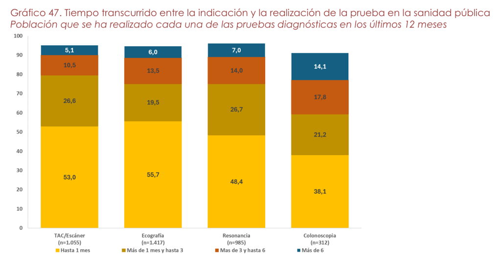 El 55,7 % de las personas que se han hecho una ecografía, el 53% de las que se han hecho un TAC, el 48,4% de las que se han hecho una resonancia y el 38,1% de las que se han hecho una colonoscopia han esperado un mes o menos desde que su médico se la indicó.