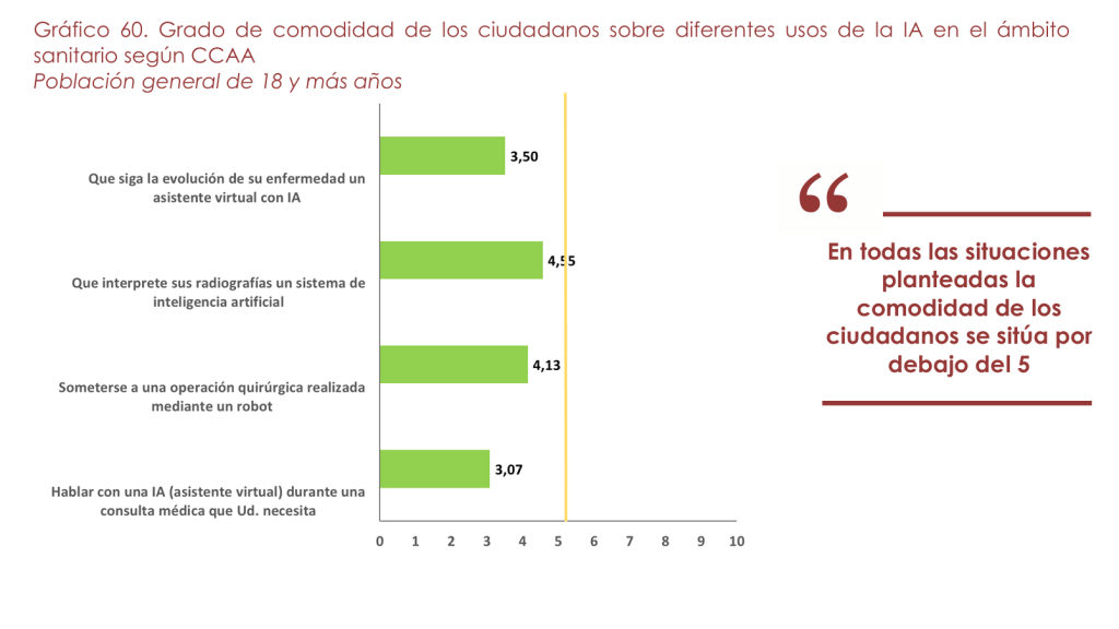 La aceptación del uso de la IA en determinadas situaciones del ámbito sanitario está por debajo de 5/10, con una gran polarización hacia la ‘total incomodidad’. El 47,5% manifiesta estar preocupado por el uso de sus datos clínicos para la IA por instituciones privadas, y un 35,8% por instituciones públicas.