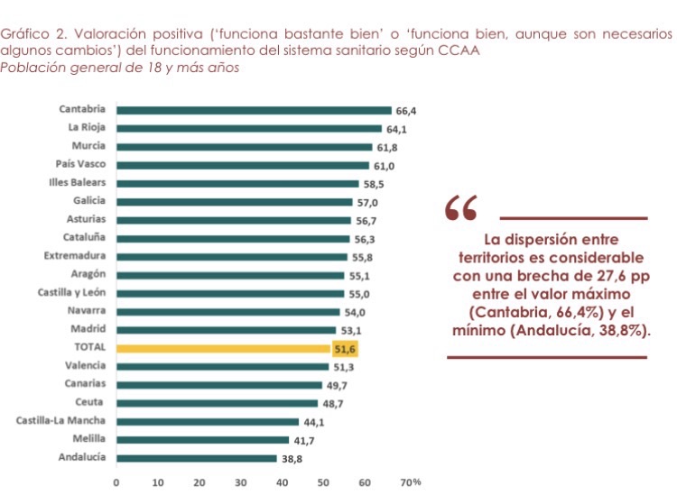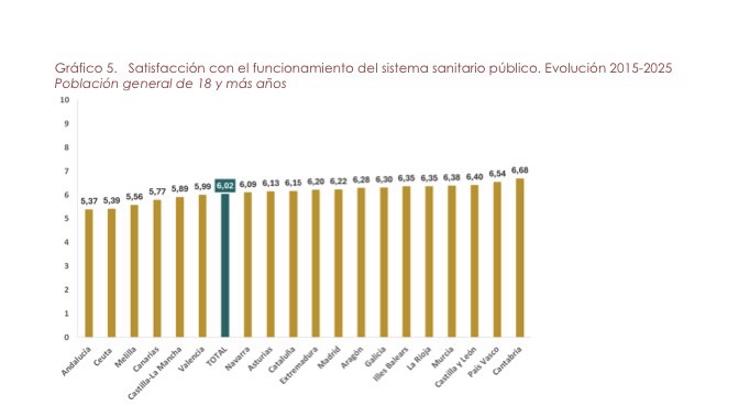Mientras que el funcionamiento del sistema sanitario en España recibe una valoración positiva del 51,6% de la población general, el 20,2% opina que “necesita cambios profundos y, la satisfacción con el sistema sanitario público (se haya utilizado o no) se sitúa en 6,02 puntos sobre 10, ligeramente inferior a los 6,22 de 2024. Ambos indicadores muestran una gran variabilidad territorial”. Un ejemplo claro es la diferencia entre el Sistema mejor valorado, Cantabria con un 66,4%, frente a Andalucía, 38,8%, una valoración muy preocupante que supone una brecha de 27,6 puntos, que otorga a nuestra Comunidad el último puesto en este indicador del Barómetro.