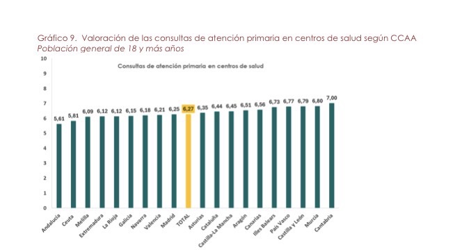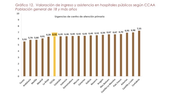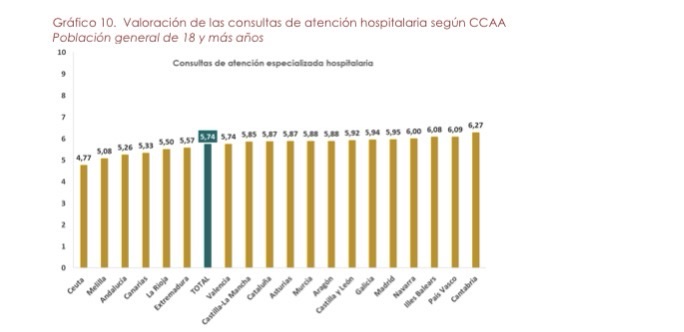 El 49,4% de la población tiene una valoración positiva de la coordinación entre los servicios de atención primaria y del ámbito hospitalario que intervienen en su atención, con una importante variabilidad territorial. Entre las CCAA con una mayor valoración positiva de la coordinación destacan País Vasco (65,8%) y el porcentaje de valoración negativa más bajo de la serie (8,5%), les siguen Cantabria (60%), Murcia (56,7%), Castilla y León (55,4%) e Illes Balears (54,2%). En el extremo opuesto, las ciudades autónomas de Melilla y Ceuta presentan los niveles de satisfacción más bajos, y los mayores índices de valoraciones negativas. Otras CCAA con valoraciones positivas por debajo del promedio nacional son Canarias (39,6% de positivos), Andalucía (42,6%) y Extremadura (44,3%). De nuevo, la posición de Andalucía en este indicador es muy baja, en términos generales.