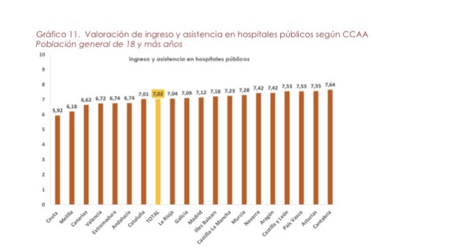 El 10,4% refiere al menos un ingreso en un hospital público en el último año. El 81,4% de los pacientes valora positivamente la atención recibida. Los aspectos mejor valorados son los cuidados de los profesionales de medicina y enfermería.