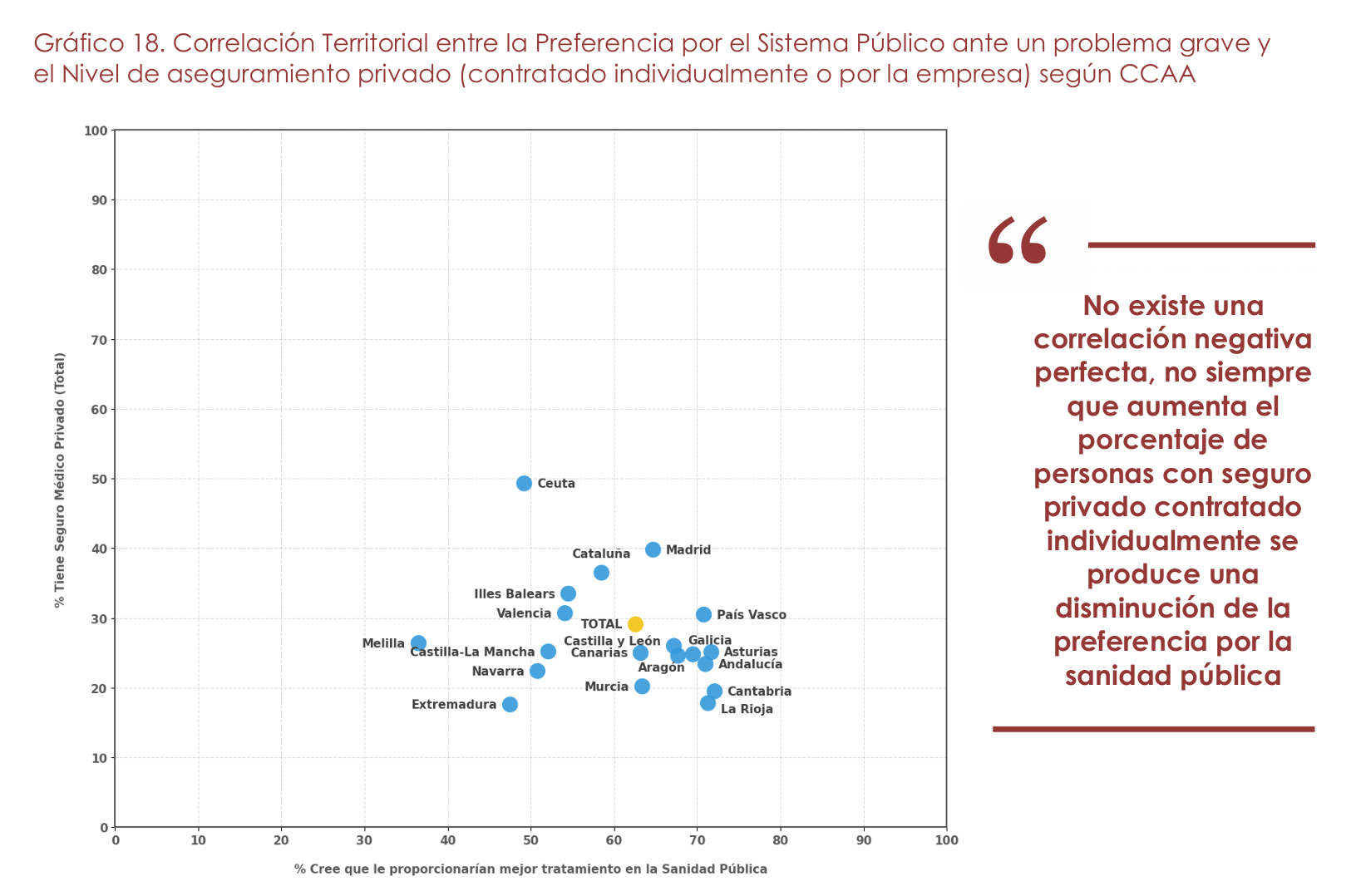 de varias modalidades de seguro por lo que no pueden sumarse directamente al existir solapamientos entre categorías. En la mayoría de las CCAA la cobertura sanitaria pública se sitúa en valores entre el 98% y el 100%, con la excepción de Melilla (94,8%) que puede estar afectada por el tamaño muestral de la encuesta en las ciudades autónomas. Existe una enorme variabilidad regional en la declaración de seguros médicos contratados individualmente o por algún familiar. Destacan por situarse en valores por encima de la media nacional Illes Balears (28%), Cataluña (26,7%) y la Comunidad de Madrid (26,6%9, aunque el máximo se sitúa en Melilla (37,7%). Este dato puede estar afectado por el tamaño muestral como hemos comentado anteriormente. En el extremo contrario se sitúa La Rioja (10,9%), la Región de Murcia (12,3%) y Navarra (13%). Las mayores diferencias se observan en la prevalencia de seguros médicos contratados por el empleador, destacando por las altas coberturas País Vasco (15,9%) y Madrid (15,1%) y en el extremo opuesto Extremadura (3,5%) y Aragón (5,1%). Se observan CCAA con un modelo sanitario de sanidad pública predominante y por otro, CCAA con núcleos urbanos e industriales (Madrid, Cataluña y País Vasco) y zonas insulares donde un porcentaje importante de ciudadanos declara disponer de algún seguro médico privado».