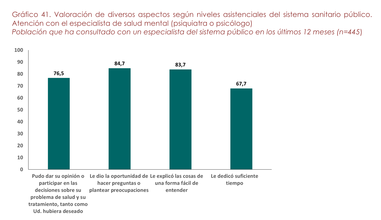 El 19,9% de las personas necesitaron consultar por un problema de salud mental. La mitad de las mismas fueron atendidas principalmente en la sanidad pública, con una valoración positiva por parte del 56%. Una tercera parte acudió a un profesional privado mediante pago directo del servicio. El 51,1% refiere haber sido atendido principalmente en la sanidad pública, el 41,9% en la sanidad privada y un 1,9% en ambas. En el caso de las personas atendidas en la sanidad pública, el 38,4% señala que fue atendido principalmente por su médico de familia, un 39,4% por un especialista en psiquiatría y un 17,2% por un psicólogo. El 26,7% de los pacientes que fueron atendidos en la sanidad pública por un profesional distinto a su médico de familia, consiguió cita con el profesional de salud mental (psiquiatra y/o psicólogo) en menos de 30 días, el 34,8% en un plazo entre 1 y 3 meses y otro 22,4% tardó más de 3 meses para ser atendido en consulta. El 68,5% de estos pacientes continúan en seguimiento con el especialista. En relación con las experiencias de los pacientes con los profesionales de salud mental (psiquiatra, psicólogo), el 83,7% valoró que las explicaciones del profesional eran fácilmente entendibles, el 84,7% refirió que, en su última consulta, el especialista le dio la oportunidad de hacer preguntas o expresar sus preocupaciones; el 76,5% pudo participar en las decisiones sobre su problema