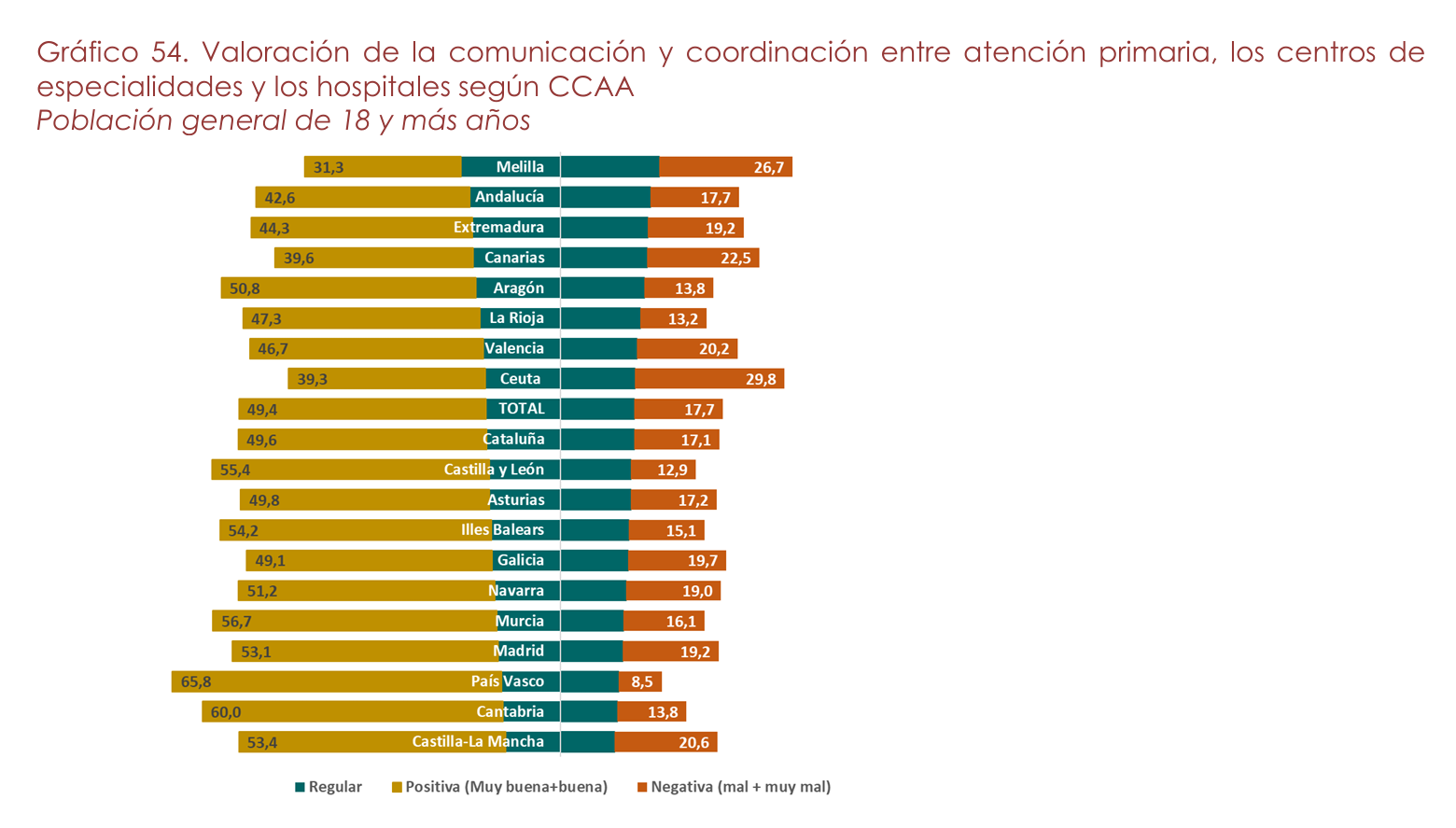 El 49,4% de la población tiene una valoración positiva de la coordinación entre los servicios de atención primaria y del ámbito hospitalario que intervienen en su atención, con una importante variabilidad territorial. Entre las CCAA con una mayor valoración positiva de la coordinación destacan País Vasco (65,8%) y el porcentaje de valoración negativa más bajo de la serie (8,5%), les siguen Cantabria (60%), Murcia (56,7%), Castilla y León (55,4%) e Illes Balears (54,2%). En el extremo opuesto, las ciudades autónomas de Melilla y Ceuta presentan los niveles de satisfacción más bajos, y los mayores índices de valoraciones negativas. Otras CCAA con valoraciones positivas por debajo del promedio nacional son Canarias (39,6% de positivos), Andalucía (42,6%) y Extremadura (44,3%). De nuevo, la posición de Andalucía en este indicador es muy baja, en términos generales.