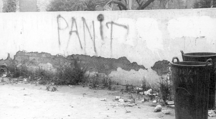 Pintada incompleta de Javier Verdejo, que le supondría la muerte por un disparo de un guardia civil, el 14 de agosto de 1976, en el barrio El Zapillo (Almería capital)